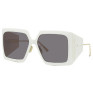 A armação em acetato branco cria um contraste elegante e luminoso, destacando-se com um visual atual e extremamente sofisticado. Os detalhes metálicos dourados adicionam um toque de luxo discreto, elevando ainda mais o design. As lentes cinza escuro garantem conforto visual e proteção eficaz contra os raios UV, oferecendo segurança e bem-estar em ambientes ensolarados, sem abrir mão do estilo.