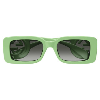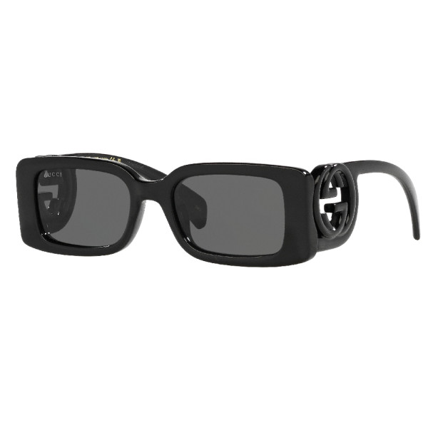 A armação em acetato preto apresenta um visual clássico e versátil, enquanto as lentes cinza sólidas adicionam um toque extra de refinamento, garantindo conforto visual e proteção eficaz contra os raios UV. O grande destaque fica por conta do detalhe inconfundível da Gucci: a faixa verde-vermelho-verde nas extremidades das hastes, assinatura histórica da maison que confere autenticidade e luxo imediato ao design.